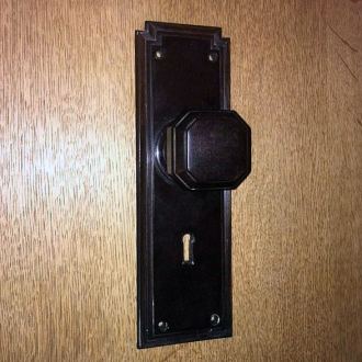 The PERMAX door knob on the lock plate. We are producing the same back-plate without the key-hole. BROLUX is skilfully modelled on this, we at Broughtons are producing them in both Walnut and Black.